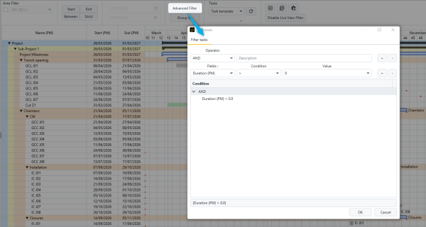 These filters help focus on a specific part of the schedule and facilitate the analysis of projects containing a large number of activities.