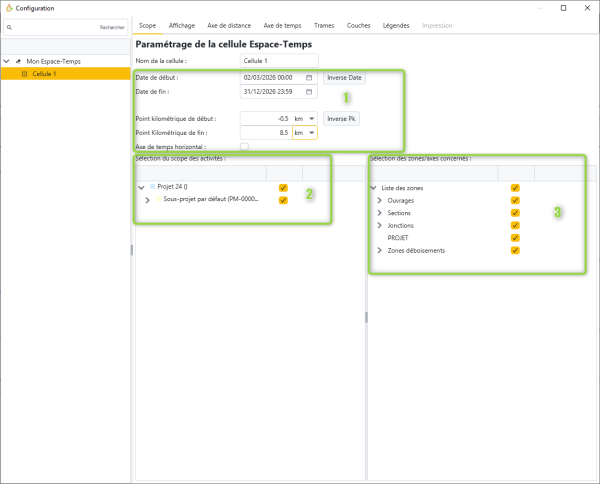 L’onglet Scope permet de définir le périmètre de la vue Espace-Temps.