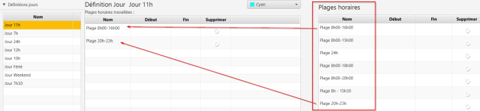 Pour chaque type de jour (Travaillé, intempérie, vacances…), il faudra ajouter une définition de jour et lui attribuer une ou plusieurs plages horaires.