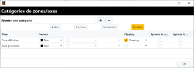 À cet endroit, pour chaque statut de chaque catégorie de zone, vous pouvez définir si vous souhaitez activer le clipping et quel plan utiliser. En général, le clipping est utilisé pour les zones terminées, sur certaines catégories spécifiques.